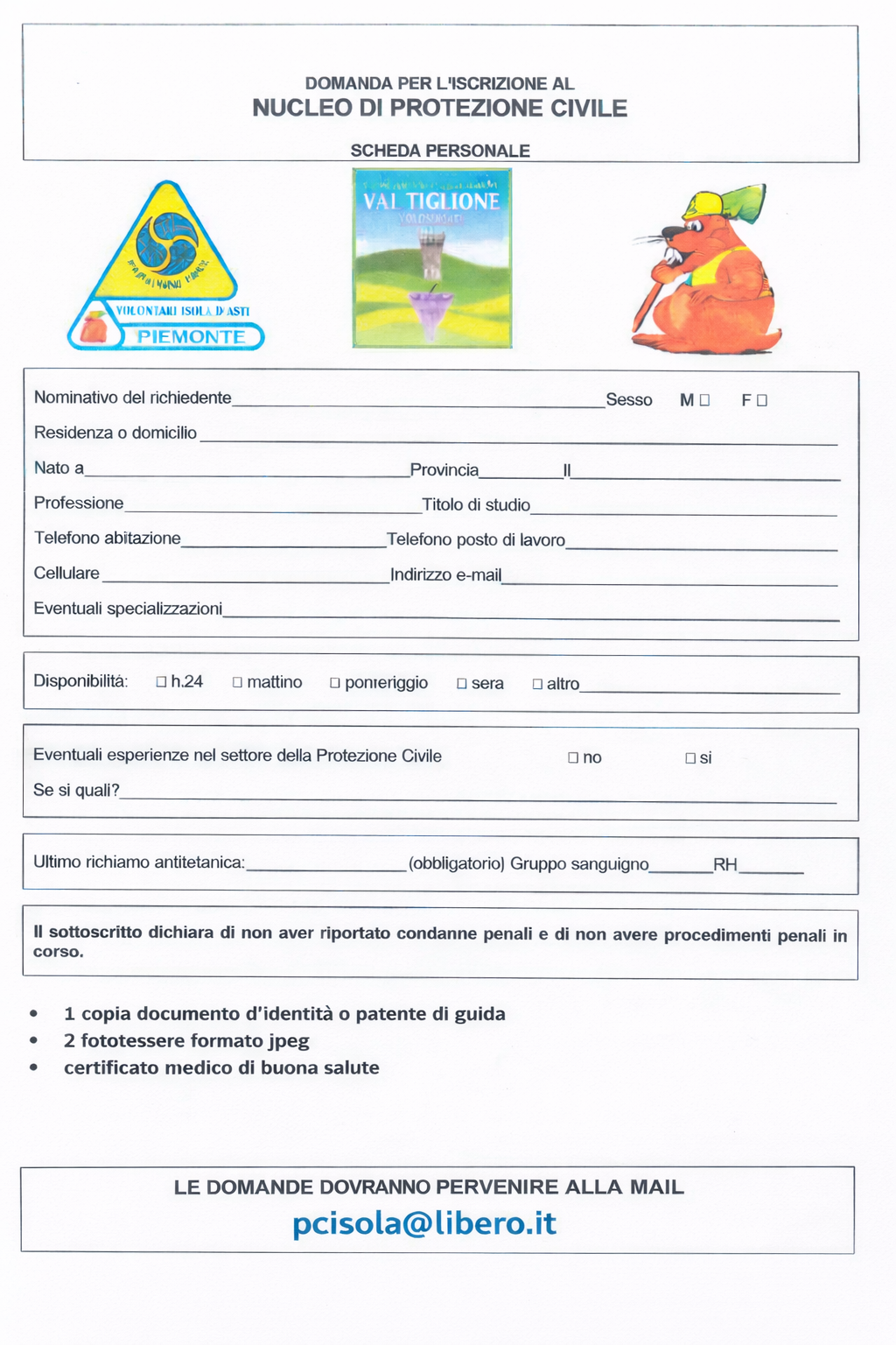 Si rende disponibile il seguente modulo per la compilazione della domanda per l'adesione al volontariato. Da compilare e inviare alla mail pcisola@libero.it